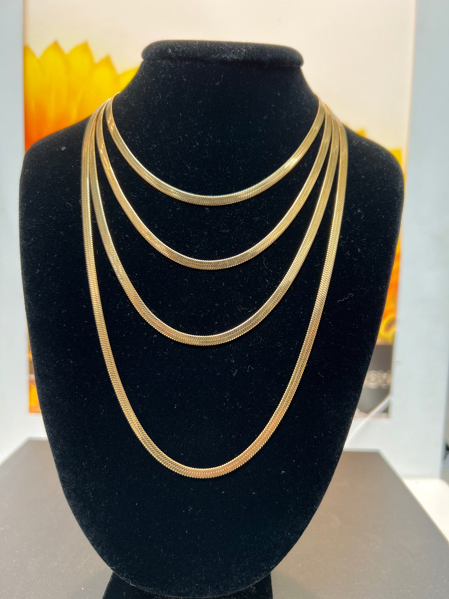 Our herringbone necklace is water resistant and tarnish free. They come in four different lengths ranging from 16 inches to 24 inches.